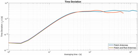 Figure 8 shows the TDEV for setup 1 (patch antennas) and setup 2 (patch and omni-directional rod antenna), which was calculated using Stable32 [27] according to the National Instggitute of Technology’s Handbook of Frequency Stability Analysis [28]. The deviations for 1 s intervals are 30 ps and increase to 3 ns in the average time interval from 2 s to 60 s. The deviations for both setups reach a plateau at around 3 ns for longer average times. Both setups obtain comparable performance, even though a stronger multipath propagation is expected with setup 2 compared to setup 1. This suggests that the system has a certain robustness against multipath propagation, which could be explained by the fact that the time synchronization system only needs to compensate the time of flight as measured by the system, while it is not required to resolve the individual propagation paths. The small TDEV difference between the two setups may partially be also due to the lack of a temperature-controlled environment for the equipment.