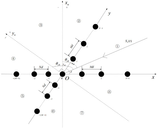 As shown in Figure 1, assume that the signal receiving array consists of two identical expanded coprime arrays, with a crossing angle denoted as . Each coprime array is composed of two subarrays, with M and N elements in each subarray, respectively.