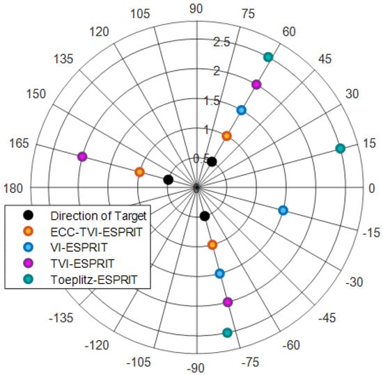 Figure 2 shows that the estimates of TVI-ESPRIT and ECC-TVI-ESPRIT algorithms are consistent with the target directions, while other algorithms can only efficiently estimate the signal directions at and , which reflects the advantage of TVI-ESPRIT and ECC-TVI-ESPRIT algorithms in the omnidirectional DOA estimation. On the other hand, the estimates from the Toeplitz-ESPRIT algorithm show significant deviation from the target directions, especially at , while other velocity-independent algorithms accurately estimate the directions, which demonstrates that the cross-array have the advantage of acoustic velocity-independence.