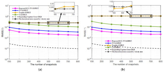 RMSE under different number of snapshots: (a) m/s. (b) m/s.