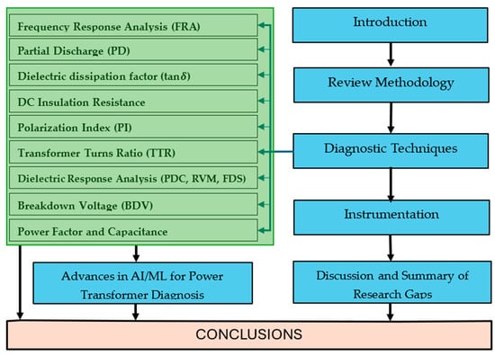 The structure of the paper is as follows: Section 1 presents the introduction, providing an overview of fault diagnosis, the taxonomy of the process, and the importance of timely fault detection. Section 2 outlines the methodology used for the literature review, including the criteria for paper selection and the potential biases of the process. Section 3 delves into the main electrical diagnostic techniques for power transformers. Each method is discussed in detail, followed by a summary of the techniques presented in a table. In Section 4, the advances in artificial intelligence/machine learning for power transformers is discussed. Section 5 examines the instrumentation needed for the various diagnostic strategies. Section 6 presents a discussion of the review’s results, highlighting key trends and research directions in diagnostic techniques. Finally, Section 7 concludes the paper, summarizing the main findings and offering recommendations for future research. In Figure 2, the flowchart of how the paper is organized is presented.