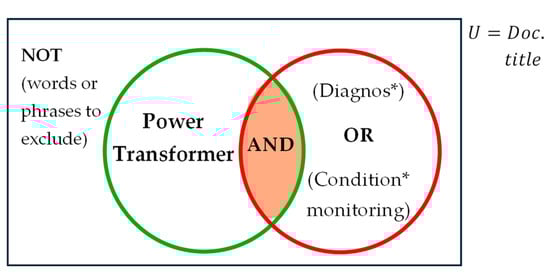 Although the data sources for this review are heterogeneous, some biases may still exist. Given that Scopus is one of the largest repositories of scientific and technical research papers, it was chosen as the primary search database. One advanced search was conducted in this database using the search command outlined above. To minimize the potential bias of overlooking relevant papers published in other reputable journals, supplementary searches were performed in the other databases mentioned. These supplementary searches were designed to identify specific papers. For example, to explore a particular diagnostic technique, a targeted search was conducted. Additionally, supplementary searches were used to locate review papers on condition monitoring for power transformer. In these cases, the advanced search algorithm was slightly adjusted to include the desired terminologies using the AND logic operator. The general advanced search algorithm is depicted in Figure 3, where the shaded intersection represents all retrieved papers.