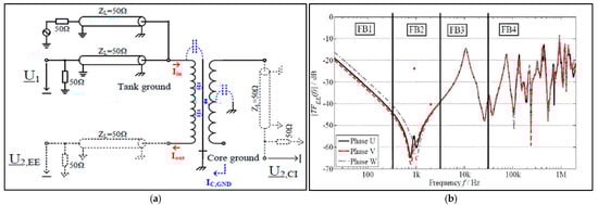 The end-to-end transfer function measurement, T F E E ( f ) , and the capacitive inter-winding transfer function measurement, T F C 1 ( f ) can be computed as follows: