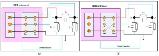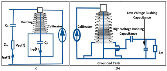 Figure 5. Partial discharge measurement setup [43]. (a) Employing external coupling capacitor (b); coupling from busing taps.