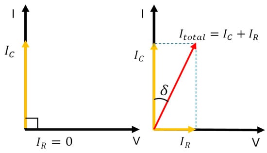 Tan delta, also known as the dielectric dissipation factor, is a critical parameter used to assess the condition and reliability of insulation systems in electrical equipment, such as power transformers. Ideally, insulating materials, or dielectrics, are expected to behave as perfect, lossless capacitors [54,55]. In this ideal scenario, the voltage and current are in a 90-degree phase shift, with the current through the insulation being purely capacitive. In practical insulation systems, however, a resistive loss current ( I R ) flows in phase with the voltage [56]. The magnitude of this resistive component is influenced by factors such as moisture, aging, and the presence of conductive impurities in the insulating oil, while the capacitive current ( I C ) is frequency-dependent [57]. The presence of contaminants reduces the insulation’s resistance, resulting in an increase in resistive current and a deviation from the ideal capacitive behavior. As a result, the phase shift between voltage and current becomes less than 90 degrees due to the combined effects of I R and I C on the total current angle. The extent of this deviation, known as the loss angle ( δ ), reflects the level of contamination and serves as an indicator of the insulation’s quality and reliability. This loss angle is carefully measured and analyzed, with the tangent of the loss angle (tan ( δ )) representing the ratio of resistive current to capacitive current [58]. By conducting a tan delta test, it becomes possible to evaluate the insulation’s resistance and overall health effectively. The classical setup for tan ( δ ) measurement is outlined in [59]. The greater is the value of tan ( δ ), compared to the value stipulated in the standards, the lower is the quality of the transformer insulation system being tested [58]. In Figure 6, the relationship between capacitive and resistive current for perfect and actual insulation is presented [58]. The IEC 60851-5:2008 standard [60] is the international document relating to the tan ( δ ) test. It provides specific guidelines for the measurement of tan ( δ ).