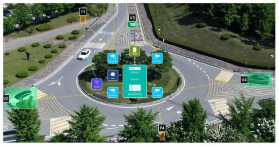 Figure 1 shows a sensor data-sharing system, in which cameras and LiDAR sensors installed along the road transmit object information to a multi-access edge computing (MEC) platform at fixed intervals. The transmitted object information includes the object type, absolute coordinates, speed, direction, and detection confidence. By aggregating these data, C-ITS ensures that autonomous vehicles are consistently updated with real-time environmental information, leading to more accurate and timely decision-making. This comprehensive approach not only benefits individual autonomous vehicles but also contributes to overall traffic management by integrating and distributing sensor data across the transportation network.