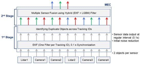 This two-stage design, implemented on the MEC platform, ensures that even if sensor data arrive with slight delays or come from different vantage points, the environment is accurately represented in near real time. As shown in Figure 2, the final output of the hybrid filter (top layer) feeds into downstream applications such as global traffic monitoring, path planning, or other C-ITS services.