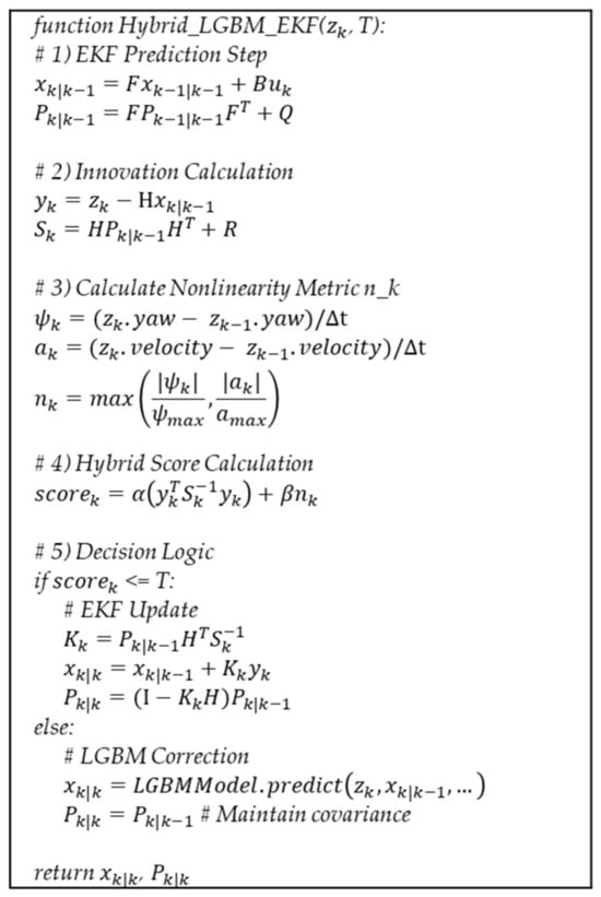 Figure 3 shows the pseudocode for our LGBM-augmented EKF filter. In this pseudocode, at the first step, an EKF prediction step is performed to obtain predicted state and covariance . Next, the algorithm calculates innovation and . Here, measures the mismatch between predicted observation and sensor reading , whereas quantifies the uncertainty of that mismatch by incorporating both predicted covariance and measurement noise R.