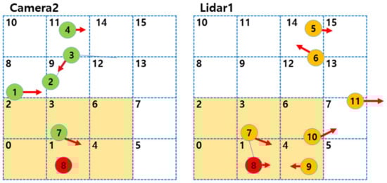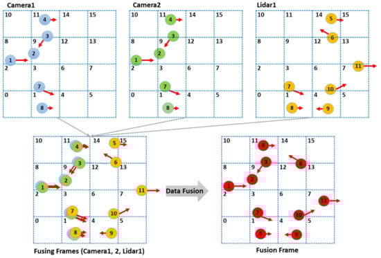 In Figure 4, each cell now bears an explicit label (e.g., 0, 1, 2, …), which visually indicates how adjacency is determined. Objects detected by each sensor are represented in different colors. In the fusing frames, overlapping objects with different colors indicate the same object with slight positional errors. Suppose an object lies in Cell 1; the method searches for matching candidates in Cell 1 itself and all immediately adjacent indices (for instance, Cells 0, 2, 3, 6, 4). This localized comparison strategy prevents unnecessary pairwise checks across the entire grid, effectively reducing the algorithm’s complexity from to approximately under typical conditions.
