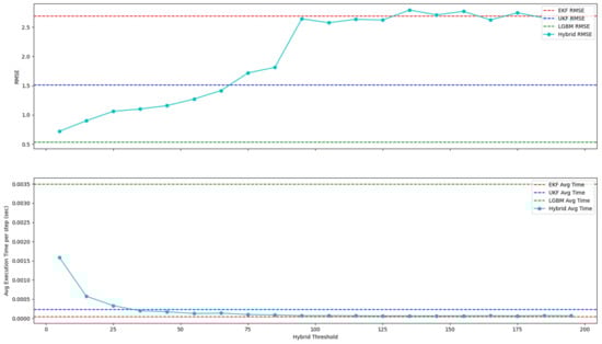 Figure 6, Figure 7 and Figure 8 show how the proposed hybrid filter’s RMSE and processing speed vary with different threshold values at a noise scale of 1. As shown in Figure 6, when the threshold is 65 or below, the resulting RMSE is lower than that of the EKF and the UKF. However, once the threshold exceeds 65, the RMSE converges to that of the EKF. In terms of computation time, using higher thresholds reduces the role of the LGBM, causing the filter’s behavior to resemble that of the EKF. In other words, a lower threshold invokes the LGBM step more frequently (making the filter function more like a standalone LGBM), whereas raising the threshold limits LGBM involvement and shifts the filter toward an EKF-like profile. Consequently, choosing an appropriate threshold is vital for harnessing the strengths of both methods.
