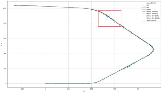 Figure 7 visualizes the ground-truth trajectory data, the observed data, and the fusion results produced by the EKF, UKF, LGBM, and hybrid approaches under varying thresholds. Although it depicts the entire trajectory, the differences among these methods are not easily distinguishable. To address this, we magnified the red-boxed region in which errors are relatively large, as shown in Figure 8. The hybrid approach at a threshold of 55.0 delivers the best performance, producing a trajectory that most closely matches the ground truth. Even where the pure LGBM and UKF methods deviate substantially from the true trajectory, the hybrid method set at a threshold of 55.0 maintains the highest accuracy.