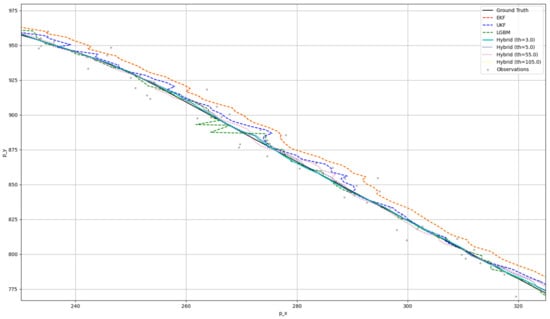 Table 5 shows the root mean square error (RMSE), mean squared error (MSE), mean absolute error (MAE), and average processing time per update step, demonstrating how each method performs at different noise scales. LGBM achieves the lowest RMSE but suffers from higher latency. Meanwhile, the EKF is very fast but less accurate, and the UKF balances nonlinearity handling at moderate speed. LGBM exhibits the lowest RMSE in all cases, but it is the slowest among the methods tested. Although LGBM is known for relatively fast inference, it may be unsuitable for real-time C-ITS applications due to latency requirements. The EKF runs very quickly but can show an RMSE that is 4–10 times higher than LGBM’s. The UKF handles nonlinear situations better than the EKF but is relatively slower. At small noise scales, the UKF and EKF are similar, but as noise scale increases, the difference becomes more pronounced.