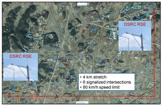 Figure 2, the study section spans 4 km and comprises a total of six signalized intersections. DSRC Roadside Equipment (RSE) was installed at both ends of the section to record the passing times of vehicles equipped with a DSRC On-Board Unit (OBU). As of the time the experimental data were collected, approximately 60% of vehicles in Korea were equipped with DSRC OBUs.