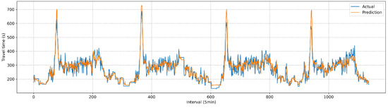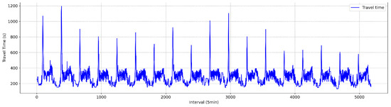 The travel time data were aggregated at 5 min intervals, in alignment with the DSRC-based traffic information system deployed on the National Highway. Daily congestion was observed between 8:00 and 9:00 a.m., whereas in the afternoon, although traffic volume increased, the rise in travel time was less pronounced compared to the morning peak period. A total of 5181 data points were collected at 5 min intervals over approximately 18 days. As indicated in