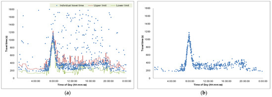 Figure 4, demonstrating that all apparent outliers were successfully filtered after applying the algorithm. As mentioned earlier, the current practice generates only one median value per aggregation interval (5 min), which prevents the identification of individual travel time records. In contrast, when the developed algorithm is applied, all individual travel time records can be retrieved, as shown in
