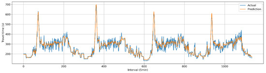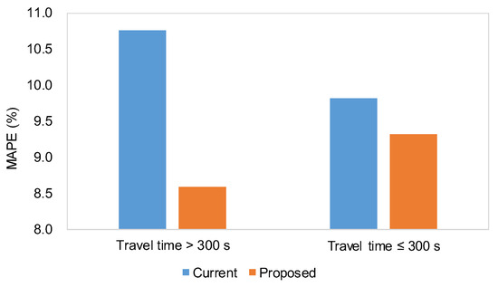 Figure 7 depict the comparisons between actual and predicted travel times for the current and proposed algorithms. Given the heightened emphasis on travel time information under congested conditions, the prediction performances were categorized into congested and non-congested conditions, with a threshold of 300 s (1.5 times the free-flow travel time of 200 s). The results indicated the performance improvement (2.2%) of the proposed method was more pronounced under congested conditions, as shown in