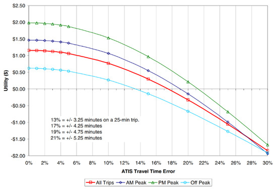 31]. According to the graph, a 2.2% reduction in error during the morning peak corresponds to a utility increase of USD 0.20 per person. When applied to the average traffic volume and passenger occupancy on the 4 km stretch of the study site, this could translate to an approximate annual social benefit of USD 135,200.