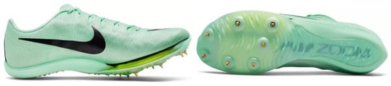For our investigation, we used commercially available Nike Air Zoom Maxfly (Figure 1) sports spikes. This spike blends ZoomX foam, which transitions to the spike plate under the forefoot, with an inserted PEBA plate at the heel. Contemporary foams, such as Nike ZoomX foam [17,36] or shoe technology [37,38], are remarkably light and sensitive, providing the best possible energy return and impact absorption. Together with a Zoom Air unit, it gives effective energy return with each stride.