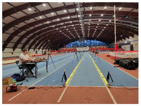 Six Witty cameras and the OptoJump-Microgate optical measurement system (Optojump, Bolzano, Italy) were incorporated into an indoor track for the four 50-m sprints. Following the sprint distance, the photocells were placed on the track at the start, at 10 m, at 20 m, at 30 m, and at the finish (50 m) (Figure 2). The sprinters performed their runs individually. They started from a semi-crouch position, aiming to accelerate as fast as possible to reach maximum running velocity. After two 50-m trials conducted in conventional spikes, the following two were conducted in carbon spikes, specifically the Nike Air Zoom Maxfly. A 5-min rest interval was included between each trial. The spatial–temporal properties of the twenty-two running steps, such as step length, step frequency, ground contact time, and flight duration, were measured using the OptoJump measurement system v.1.14.0. The Optojump photoelectric measurement system (Optojump-Next, Microgate, Bolzano, Italy) employs a network of connected rods with 2 bars (100 cm × 4 cm × 3 cm) that emit/receive invisible LED light beams with a grid resolution of 1 cm. Thirty-two photocells are mounted on each rod (RX bars and TX bars), spaced 4 cm apart and 0.2 cm above the surface. Each footstep interrupts the light transmission and is detected at an accuracy of 1 ms. The OptoJump system works contact-free and accurately (1000 Hz sampling rate). For processing and storing data, the gadget and computer were integrated. For analysis, all four sprint timings were used.