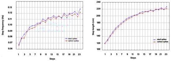 The OptoJump Next-Microgate sensor measurement system (Optojump, Bolzano, Italy) is used to measure the essential kinematic sprinting variables. Thanks to this new technology and kinematic measurement capabilities, it is possible to check whether and how the latest carbon-plated spikes affect a sprinter’s speed capabilities. The OptoJump System’s (v.1.14.0) modular configuration, optical sensors, and LED measurement (spatial measurement accuracy of 1.41 mm and time measurement accuracy of 1 ms) enables the precise acquisition of sprint kinematic parameters [22,33,34,35]. Therefore, the main goal of this study is to determine whether the type of spike can influence the final sprint result by comparing step by step the kinematics of 50-m sprints of elite Polish juniors wearing carbon-plated and conventional spikes. Additionally, we can assume that the ground contact time and flight time, related to the recoil and accumulation of elastic energy from the rigid sole of the carbon spike, are among the predicted spatial–temporal aspects responsible for improving sprint performance.