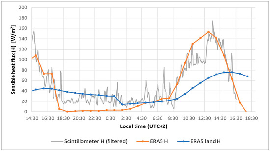 For a better assessment of the quality of the retrieved values of sensible heat flux from ERA5 and ERA5-land, we compared their values with those measured using a scintillometer for approximately 28 h. The measurements were conducted over 600 m of asphalt on the 23–24 September 2023 on a former airport facility in Interlaken (Switzerland). The scintillometer used was a BLS900 from Scintec (Tübingen, Germany). The evolution of the measured sensible heat flux (after some filtering to reduce the original noise) and the ERA5 and ERA5-land values are presented in Figure 1. During the daytime, the ERA5 values closely match the measured ones. During the night, however, ERA5 tends to underestimate the sensible heat flux compared with the measurements, while the ERA5-land values are slightly higher.