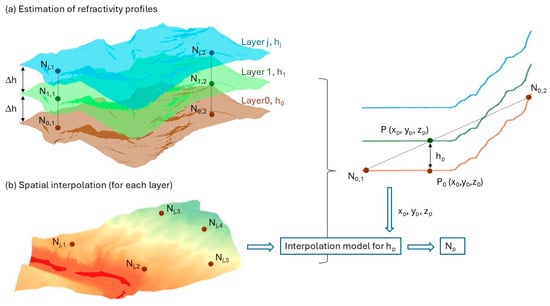 Meteorological sensors are deployed at specific locations within the study area, each installed at a height above ground (h0,i), where i represents each meteorological sensor. For practical purposes, the sensors are assumed to be positioned at approximately the same height, denoted as h0. However, when sensors are installed at significantly different heights above ground (i.e., with differences exceeding the chosen interval between layers, Δh), an additional adjustment is required to align the refractivity values to a common reference height h0. This adjustment is achieved using the TTM, analogous to step 1 of the model.