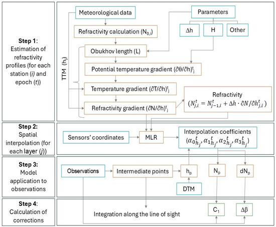 The model implementation is divided into four steps: estimation of refractivity profiles, spatial interpolation at each layer, model application to observations, and calculation of distance and vertical angle corrections. The overall workflow of the model is shown in Figure 3.