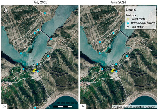 Among the reasons that explain why this area perfectly suits the purpose of this study, we can highlight two: first, the complex topography, which includes a cliff and a water reservoir, prevents the installation of meteorological sensors at critical points, such as those on the cliff; and second, the existence of a well-established geodetic network of ten pillars in the area, which have been monitored over several years, and may well serve as reference points. In addition to the geodetic network, 15 prisms are mounted on the rock for long-term monitoring [42]. For this study, a selection of these prisms located on a specific section of the cliff are used as control points (CPs).