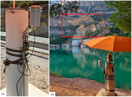 (a) Detail of a meteorological sensor with self-ventilated shelter. (b) Total station and meteorological sensor in point 8009 in the June 2024 campaign. The area of target points is marked in red.