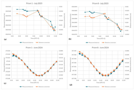 Evolution of the measured distances and the corresponding corrections: (a) point 1, July 2023; (b) point 6, July 2023; (c) point 1, June 2024; (d) point 6, June 2024.