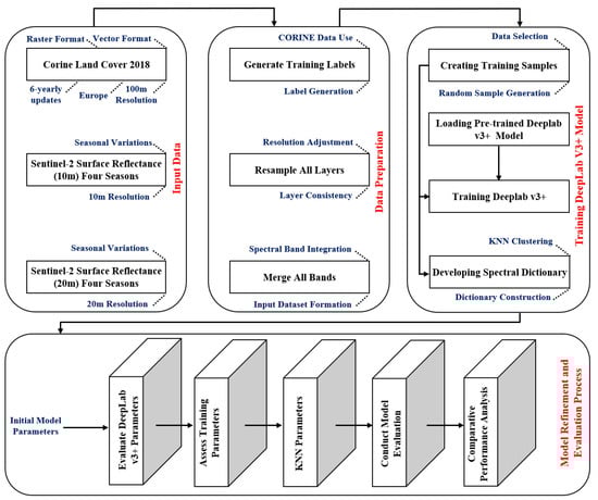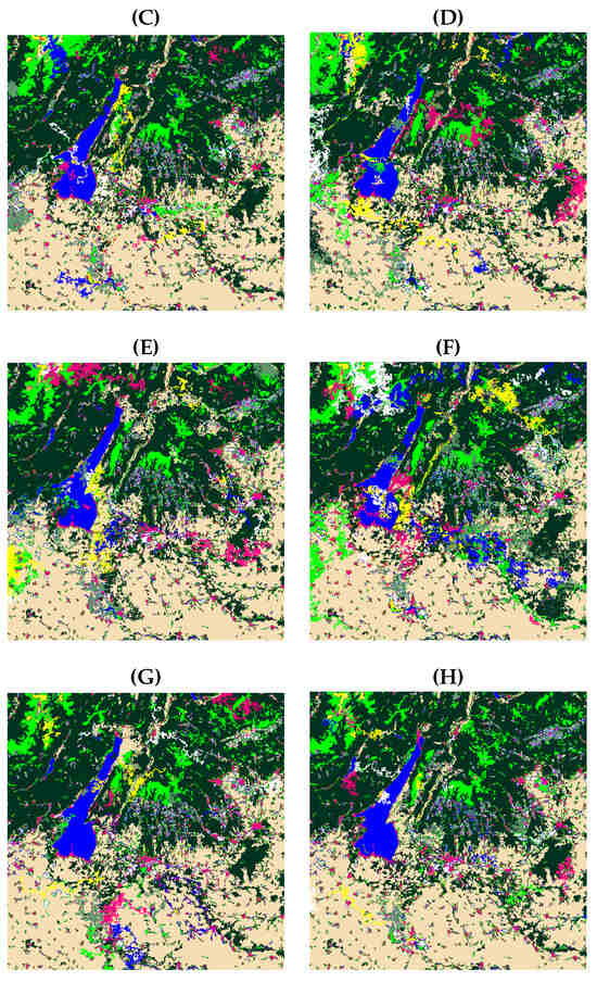 Yuan et al. (2022) [24] proposed SITS-Former, a pre-trained spatial–spectral–temporal representation model designed for LCC from Sentinel-2 satellite time series. The methodology employs a Transformer encoder backbone, pre-trained through a self-supervised learning task of missing-data imputation to capture high-level spatial and temporal dependencies. Sengan et al. (2022) [25] proposed a hybrid learning model, RAVNet, for efficient LCC using multispectral satellite imagery. The model integrates residual attention mechanisms with the VNet framework to blend low-level and high-level feature maps, enhancing spatial and contextual information extraction. Paris et al. (2022) [26] developed a scalable, high-performance, unsupervised system for producing high-resolution LC maps. Their methodology employs a tile-based, parallelizable approach using Sentinel-2 imagery. The feature extraction step incorporates robust spectral indices, while the classification step relies on an ensemble of SVMs with Gaussian radial basis functions. The segmentation step is achieved through K-means clustering to refine “weak” training sets extracted from coarse LC map units.