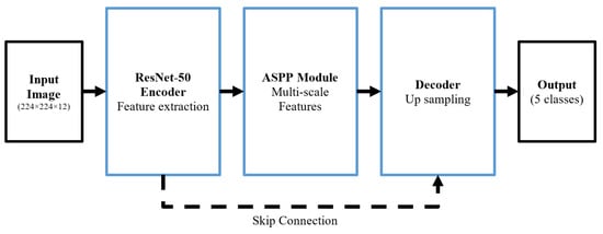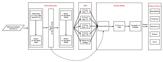 The DeepLabv3+ architecture [61] is recognized as one of the most powerful models for semantic image segmentation [13,62,63]. By leveraging advanced deep learning techniques, it can extract complex semantic features from multispectral images. This architecture combines several approaches, such as Atrous Convolutions and multi-scale attention mechanisms, to achieve high performance in identifying and classifying Earth’s surface features. The DeepLabv3+ architecture combines the feature extraction capabilities of ResNet-50 with advanced mechanisms such as atrous spatial pyramid pooling (ASPP) and a decoder [64]. Leveraging innovative techniques like shortcut connections and an adaptive decoder effectively addresses key challenges in processing multispectral satellite imagery, including the scale diversity of features, spectral complexities, and significant variations in imaging conditions. As illustrated in Figure 4, the DeepLabv3+ architecture is composed of three main components: ResNet-50, the ASPP module, and the decoder [61,65,66].