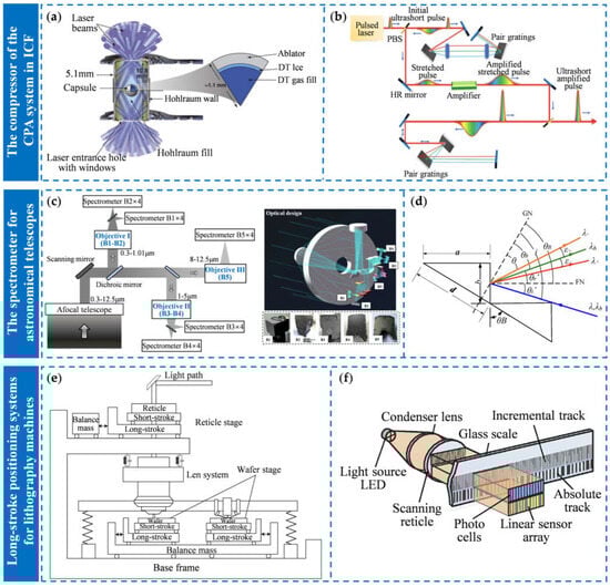 The applications of large-scale gratings: (a) the schematic of NIF ignition target [55]; (b) the scheme of chirped pulse amplification [56]; (c) the spectrometer for astronomical telescopes [57]; (d) the diffraction schematic of the echelle grating [58]; (e) the schematic of a lithography machine [59]; (f) an absolute grating encoder with a single M-code absolute track and an incremental track [60].