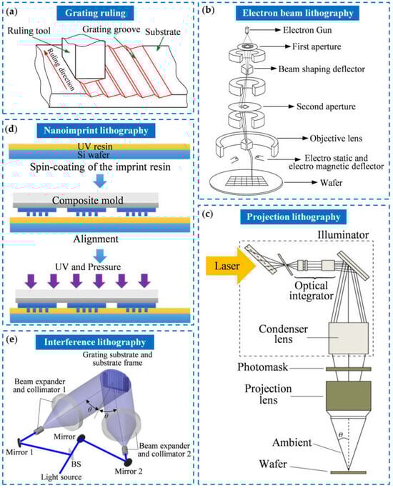 The fabrication technology of diffraction gratings: (a) the schematic view of a chisel-edge ruling tool and the grating ruling process [81]; (b) the electron beam lithography system [82]; (c) the scheme of the nanoimprinting and etching process [83]; (d) the schematic of the optical projection system [84]; (e) optical configurations for the laser interference lithography based on the division of amplitude method [85].