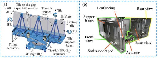Based on the tiling error theories, researchers from various countries have conducted experimental research on grating tiling devices and stability control. In 2007, Qiao et al. from the University of Rochester designed a tiling device, as shown in Figure 4a [110], which tiled three gratings with a size of 0.47 m into a large grating with a size of 1.41 m. Each small grating was fixed by a support frame, and the tetrahedral truss was used to ensure the accuracy and stability of the grating tiling device. The grating tiling device could adjust the five freedom degrees of the moving grating through an intermediate turntable, two electric linear actuators, and three piezoelectric ceramic actuators, and could reach a translation accuracy of 130 nm and a rotation accuracy of 0.2 μrad. In 2008, researchers from Osaka University designed a grating tiling device, as shown in Figure 4b, for the FIREX-1 project [111], which tiled two gratings into a large-size grating of 920 mm × 410 mm. The actuation unit of the device could achieve precise adjustment of the position and posture of the moving grating. The calculation results showed that the RMS value of the surface deformation of the tiled grating is less than 0.05. The CEA CESTA in France designed a grating tiling device to obtain several gratings with a size of 450 mm × 420 mm [112,113]. They adjusted the tiling errors of moving grating through a mechanism which consisted of a V-shaped slope and a steel ball, and added rib plates to improve the tiling stability. This tiling device could reach a translation accuracy of 50 nm and a rotation accuracy of 1 μrad. The University of Jena, Germany, also designed a tiling device [114]. They used high-precision piezoelectric actuators to drive the translation rotation stages, so that the translation error was less than 40 nm and the rotation error was less than 0.4 μrad. Zhang et al. from Chongqing University, China, also conducted experimental research on grating tiling [115,116]. In 2011, they designed a 2 × 2 tiling device [117]. This tiling device could tile four gratings with a size of 210 mm × 150 mm. The tiling accuracy was calculated to be 60 nm by measuring the grating dispersion focus. In 2015, they designed a tiling device using the truss, which could tile two gratings with a size of 420 mm × 210 mm [118]. This device used a structure combining a V-shaped slope and a steel ball to support the moving grating, and used a tetrahedral truss to improve the stability of the tiled grating. The adjustment unit used piezoelectric ceramics actuators, which could adjust the three freedom degrees of tiling error pairs accurately.