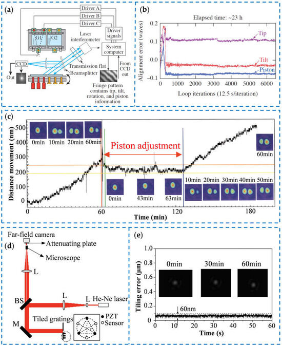 Stability control of the tiled gratings: (a) the system diagram of pose detection [120]; (b) the time stability of tiling errors [120]; (c) temporal evolution of displacement of one motion sensor [122]; (d) the schematic of focal spot measurement for different phase dispersions [117]; (e) the result of different focal spots within 1 h [117].