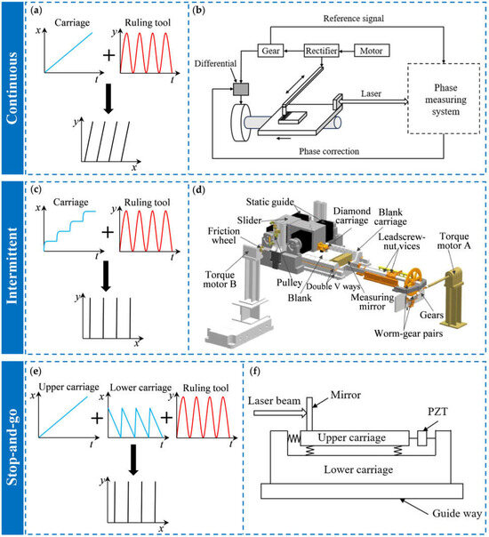 Three types of grating ruling engines: (a) the schematic diagram of the continuous ruling method; (b) the system of MIT-A ruling engine [129]; (c) the schematic diagram of the intermittent ruling method; (d) the schematic diagram of the CIOMP-6 ruling engine [132]; (e) the schematic diagram of the stop-and-go ruling method; (f) the schematic diagram of the Hitachi-4 blank carriage [133].