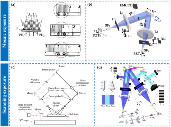 With the advent of lasers, holographic laser interference lithography (LIL) has begun to be applied in the field of grating fabrication. Compared with traditional grating ruling technology, the gratings fabricated by LIL do not have the ghost lines and stray light in diffraction. In addition, LIL has a short processing time, high success rate, and large processing area. Its processing efficiency is much higher than that of grating ruling. Therefore, it is often used in the fabrication of large-size diffraction gratings. Fabrication technologies of large-size grating based on LIL are mainly divided into single-exposure lithography [143,144,145], mosaic exposure lithography [146,147,148,149], and scanning exposure lithography [150,151,152,153].