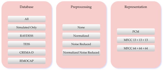 To construct our experimental corpus, we utilized a selection of databases, each comprising PCM (Pulse Code Modulation)-encoded WAV files. However, the encoding formats, sample rates, and other audio characteristics varied significantly across the databases. For instance, the CREMA-D database had a sample rate of 16 kHz, while others used 48 kHz. Additionally, two databases were recorded in stereo, while the remaining two were mono. We resampled the audio files to 16-bit, 16 kHz, and mono signals to ensure uniformity across all datasets.
