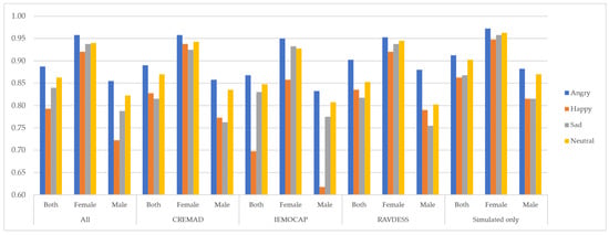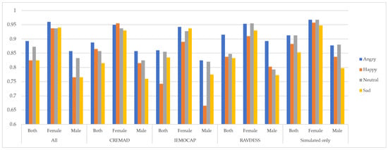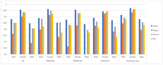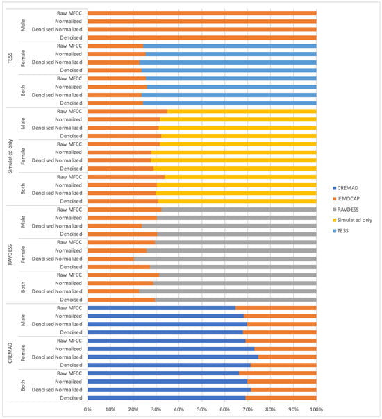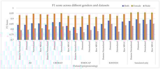 One of the key features in gender identification is the signal’s high- and low-frequency energy content [43]. Consequently, these preprocessing methods are likely to reduce gender-specific characteristics in speech. Based on this observation, we hypothesized that normalization and spectral noise reduction would remove more gender-specific discriminative content than emotional information from the speech signals.
