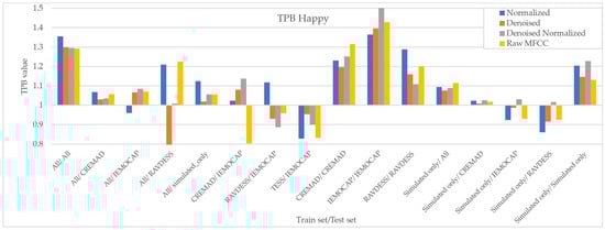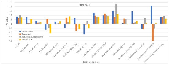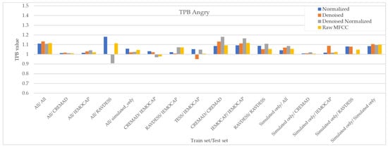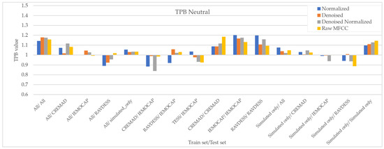 As Figure 7, Figure 8, Figure 9 and Figure 10 illustrate, regardless of preprocessing methods and training datasets, we have witnessed lower TPB (0.85 < TPB < 1.2) for Angry and Neutral emotions compared to Happy and Sad (0.6 < TPB < 1.5). This means our best-performing classifier is transferring bias on Happy and Sad emotions, and the training data have a high impact on the performance of models in Happy and Sad detection. Additionally, as can be found from the reported Figures, different preprocessing approaches, i.e., Denoising, Normalization, or both, cannot shift the bias in models. However, our augmentation approach (Simulated only or All) can effectively shift the bias in the model and push biases in the desired direction and, in some cases, fully de-bias the models, e.g., Simulated only/All.