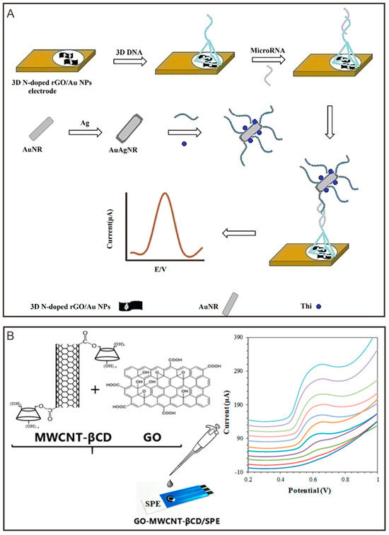 Graphene and its derivatives participate in the construction of electrochemical sensors. (A) Schematic diagram of electrochemical detection of miRNA-155 [103]. Copyright 2018, Elsevier B.V. (B) Carbon electrode modified by MWCNT-βCD composite and corresponding electrochemical signals [104]. Copyright 2020, American Chemical Society.