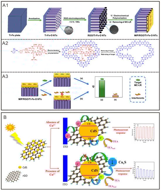 In their study, Song et al. [111] described a photoelectrochemical sensor platform that utilizes graphene functionalization (Figure 2A1–A3). This platform is based on molecularly imprinted polymer/rGO/Ti-Fe (MIP/rGO/Ti-Fe) nanotube (NT) electrodes, with rGO serving as a bridge among the sensors. Photogenerated electrons migrate from rGO to Ti-Fe NTs, while holes move in the opposite direction through the same carrier. The exceptional conductivity and π-π conjugated structure of rGO significantly enhance the carrier migration rate, resulting in improved sensor conductivity. Additionally, the study revealed that potential interactions between the hydroxyl and carboxyl groups on the surface of rGO and the Ti-O framework of TiO2 may enhance the interfacial stability between graphene oxide and Ti-Fe NTs. Consequently, the sensor demonstrated good conductivity and light responsiveness, as well as high sensitivity and selectivity towards pollutants, offering a promising photoelectrochemical sensing platform for the analysis of various contaminants.