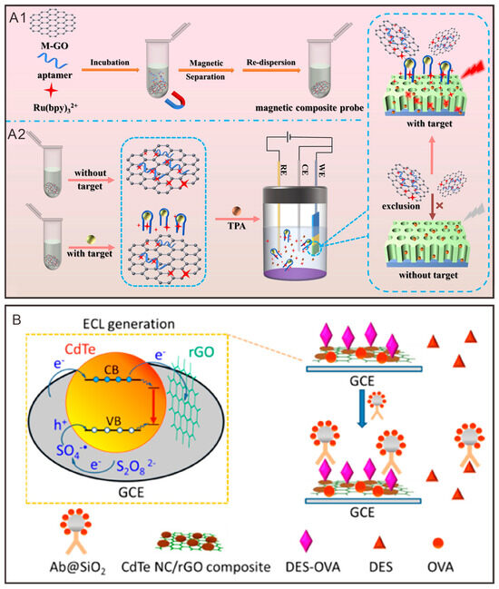 Electrochemical luminescence sensors have evolved from simple detection devices to sophisticated stand-alone chemiluminescent systems. Zhou et al. [117] established a homogeneous ECL aptamer sensor platform that operates without fixation or labeling (Figure 3A1,A2). This platform comprises a magnetic composite probe and a vertically ordered mesoporous silica film (VMSF)-modified electrode, where the magnetic composite probe utilizes M-GO as the adsorbent material. M-GO exhibits strong magnetic properties and a high density of oxygen-containing functional groups, making it versatile for various applications and enabling the construction of high-sensitivity sensors. In this configuration, the adsorption capacity of M-GO mitigates background signals, while the significant enhancement of the ECL signal by VMSF/ITO ultimately results in high sensitivity and low detection limits for alpha-fetoprotein (AFP) and prostate-specific antigen (PSA). This sensor offers an efficient and highly sensitive approach for detecting trace biomarkers in clinical bioanalysis.