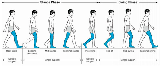 In gait data collection, it is necessary to identify the various phases and parameters of the human gait cycle (GC), as shown in Figure 1 [34]. Eight states are required to complete a gait cycle: heel strike (HS) (initial contact), loading response, mid-stance, terminal stance, pre-swing, toe-off (initial swing), mid-swing, and terminal swing.