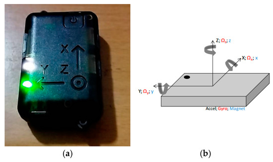 (a) NGIMU; (b) schematic diagram of the nine-axis sensor coordinate system.
