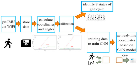 Figure 5 illustrates the data analysis process. Using WiFi, the data measured by the NGIMU (six-axis data and Euler angles) is saved to a computer in Excel format. These data are then converted into XYZ spatial coordinate distance values, with the x-axis representing forward distance, the Y-axis representing left (+) and right (−) deviation during forward movement, and the Z-axis representing heel height. The calibration procedure is used to calibrate the XYZ distance measurements. The calibrated values can determine the occurrence points of the GC’s eight states and serve as labels for supervised learning, training a model to map the original six-axis data to XYZ spatial distance values. This paper uses a convolutional neural network (CNN) model to train the data.