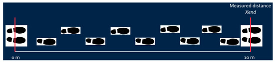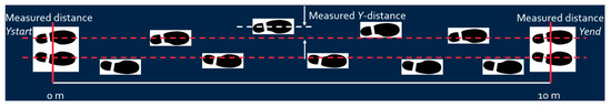 - X-axis distance calibration: The predetermined x-axis length value (e.g., 10 m) calibrates the calculated x distance based on Equation (1) as shown in Figure 6.where is the measured x-axis distance obtained from IMU, is the measured x-axis distance at the end point, and is the calibrated x-axis distance;
