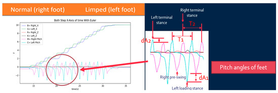 In this paper, we used simple IMU-based wearable devices to collect gait data of post-stroke patients and derive G.A.I.T. scores based on the GC’s state parameters. These scores are compared with those evaluated by the patients’ doctor. The parameters of GC’s states used for G.A.I.T. score are the pitch angles of the left terminal stance, right terminal stance, left loading stance, and right pre-swing and the times associated with these states, as shown in Figure 10 where the limped foot of the patient is left foot. The following variables are defined and used for calculating G.A.I.T. score based on Equations (4)–(20).