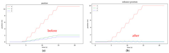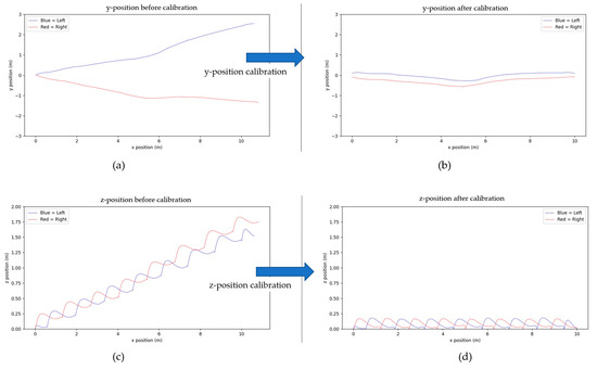 Close look of x- and z-positions before and after calibration. (a) y-position before calibration; (b) y-position after calibration; (c) z-position before calibration; (d) z-position after calibration.